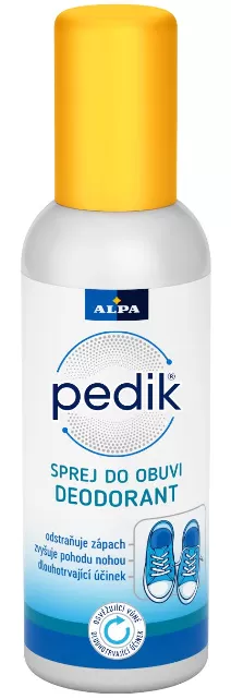 Alpa Pedik DEO Sprej do obuvi je rychleschnoucí lihový deosprej obsahující deodorační přísadu, která odstraňuje zápach a zároveň působí antimikrobiálně.
