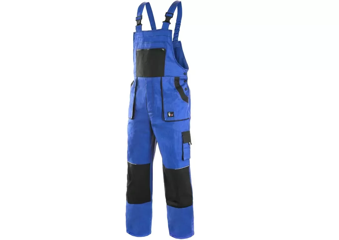Pánské montérkové kalhoty s náprsenkou - prodloužená varianta na výšku 194 cm. Náprsní kapsa na zip, pas vzadu do gumy, přední kapsy, boční kapsa na svinovací / skládací metr, boční kapsa na mobil / peněženku, zdvojená kolena, zadní kapsa s klopou, šle s gumou vzadu, reflexní doplňky. Doporučené použití: stavebnictví, lehký průmysl, logistika, skladová manipulace, autoservisy, údržba, montáže, zemědělství, zahrada, hobby.